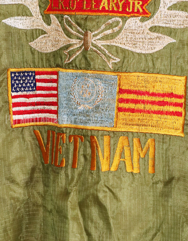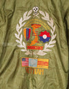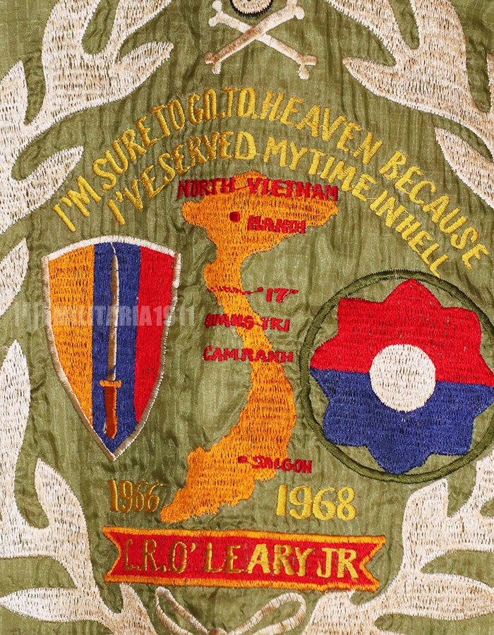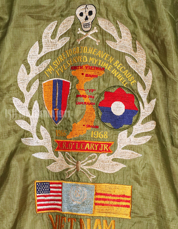 ベトナム戦争当時にお土産としてサイゴンや、その他米軍基地のある国などで販売されていたスーバニアジャケット、通称ベトジャンのレプリカ再現品です。ジャケットはODの実物米軍ポンチョのナイロン生地が使用されています。裏地の人口ポリ製の綿はなく薄い仕上がりです。春先、秋などにちょうど良いジャンパーです。刺繍は手刺繍で施されており、わかりやすいデザインです。中古品になりますので返品はできません。ご了承くださいませ。