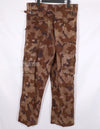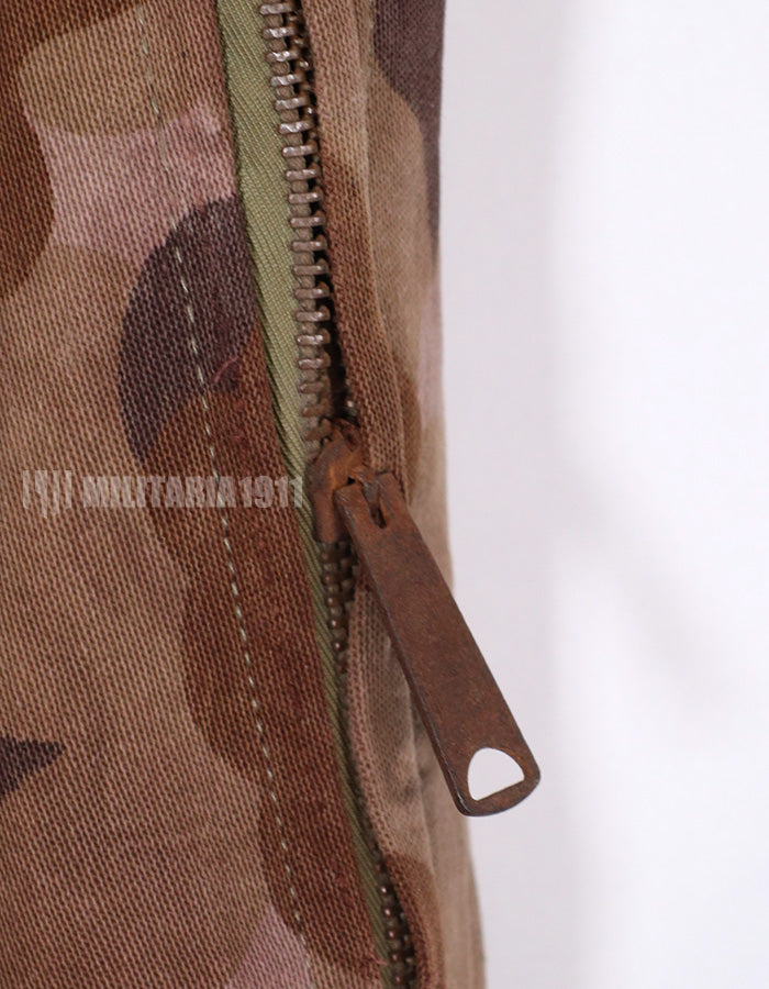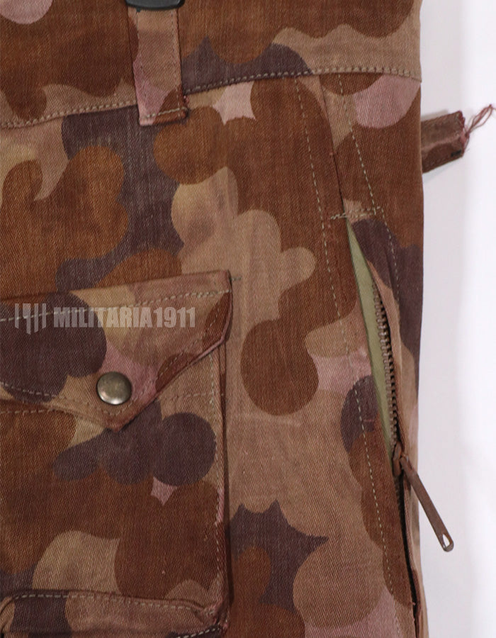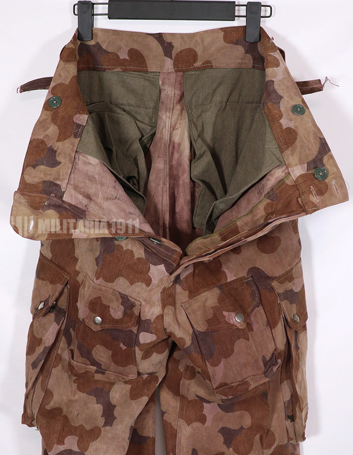 実物生地を使用した、フレンチカットの空挺パンツです。迷彩は南ベトナム国家野戦憲兵が使用したクラウと迷彩生地が使用されています。金具などに劣化があり、錆が出ています。生地も使用感があり、全体的に茶色い印象のくすんだ汚れがあります。退色もありますが、使い込まれた具合がとても良い雰囲気のパンツです。全体的に大きめではありますが、空挺パンツですので大きめの作りになっています。再現だけでなく、普段でも使いだっての良いパンツです。中古品ですので返品はできません。ご了承くださいませ。