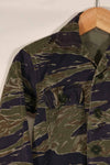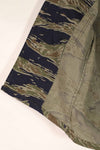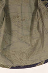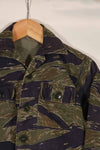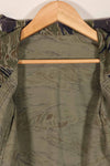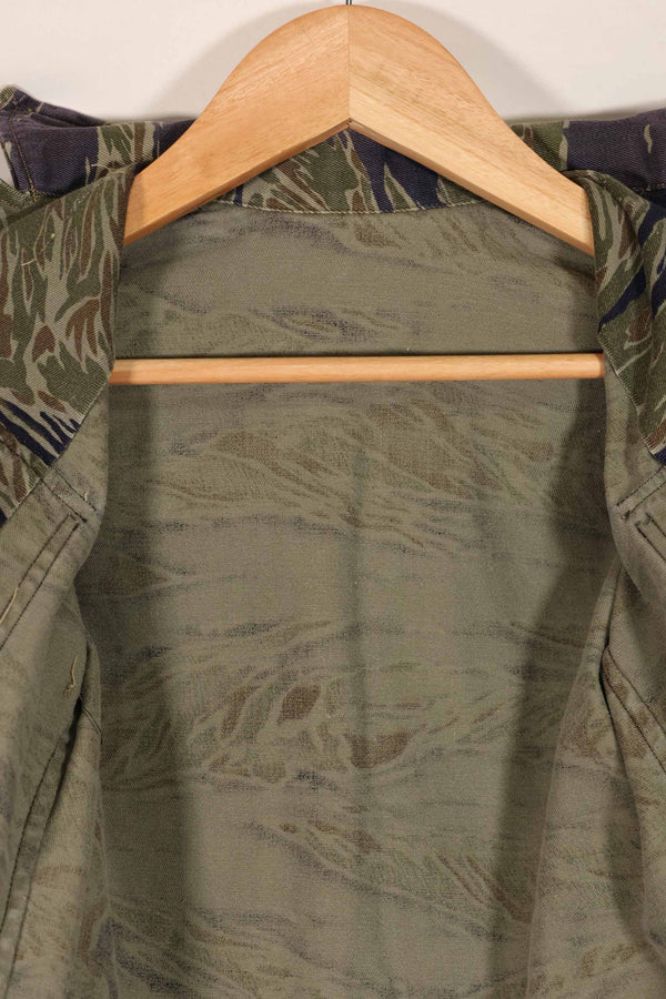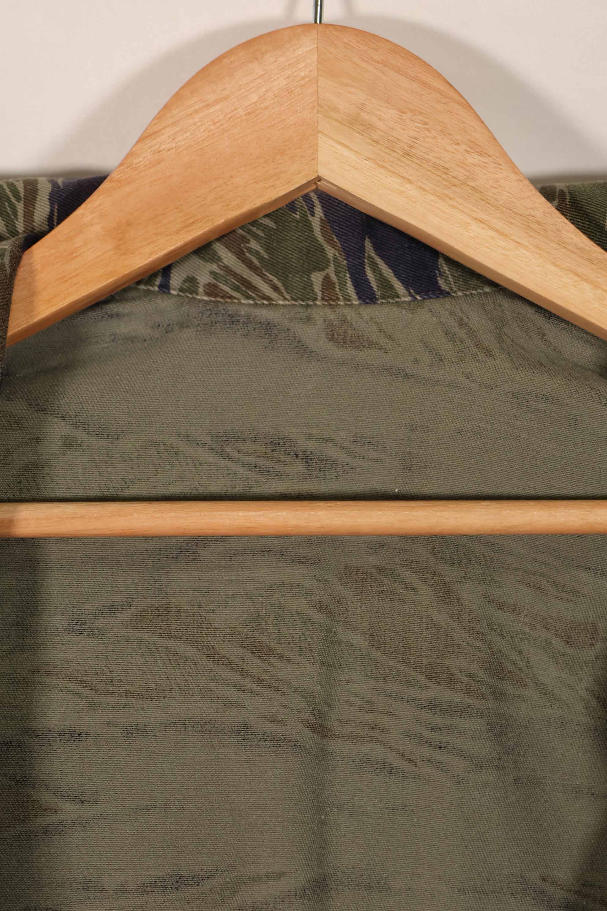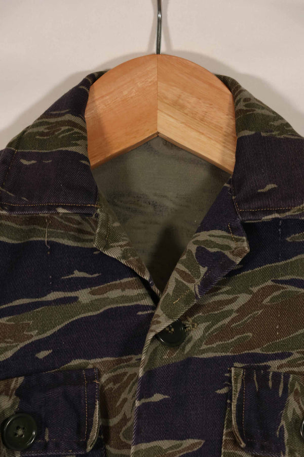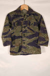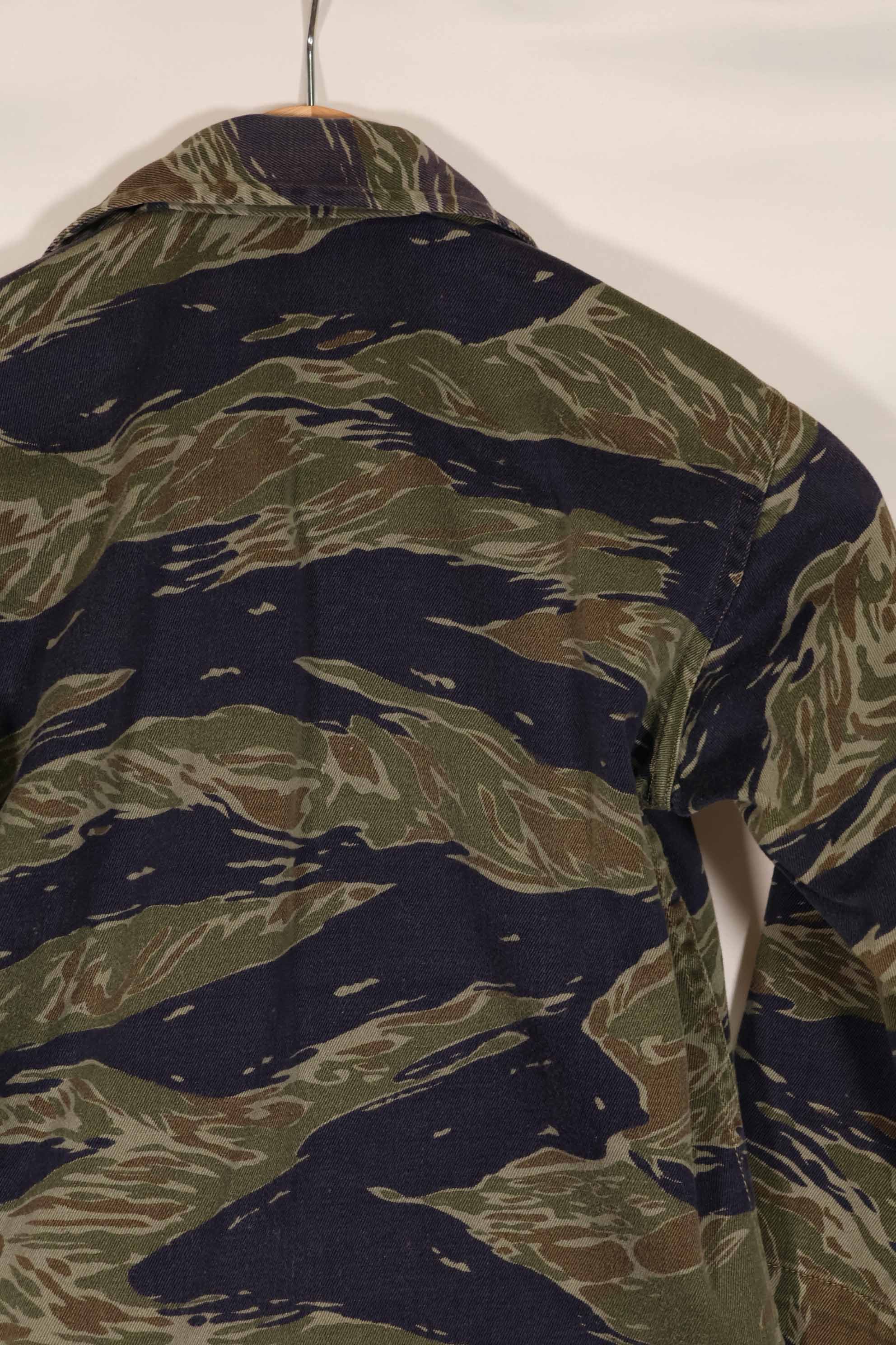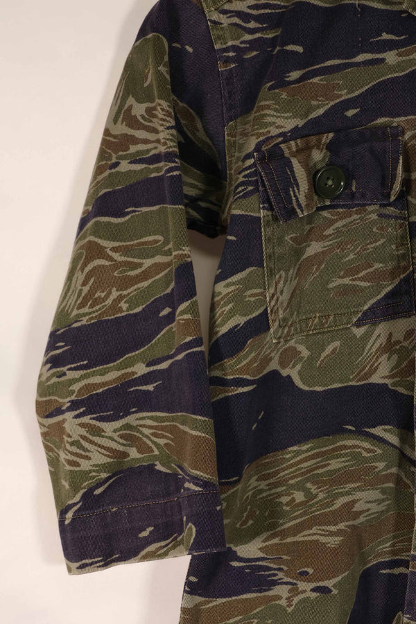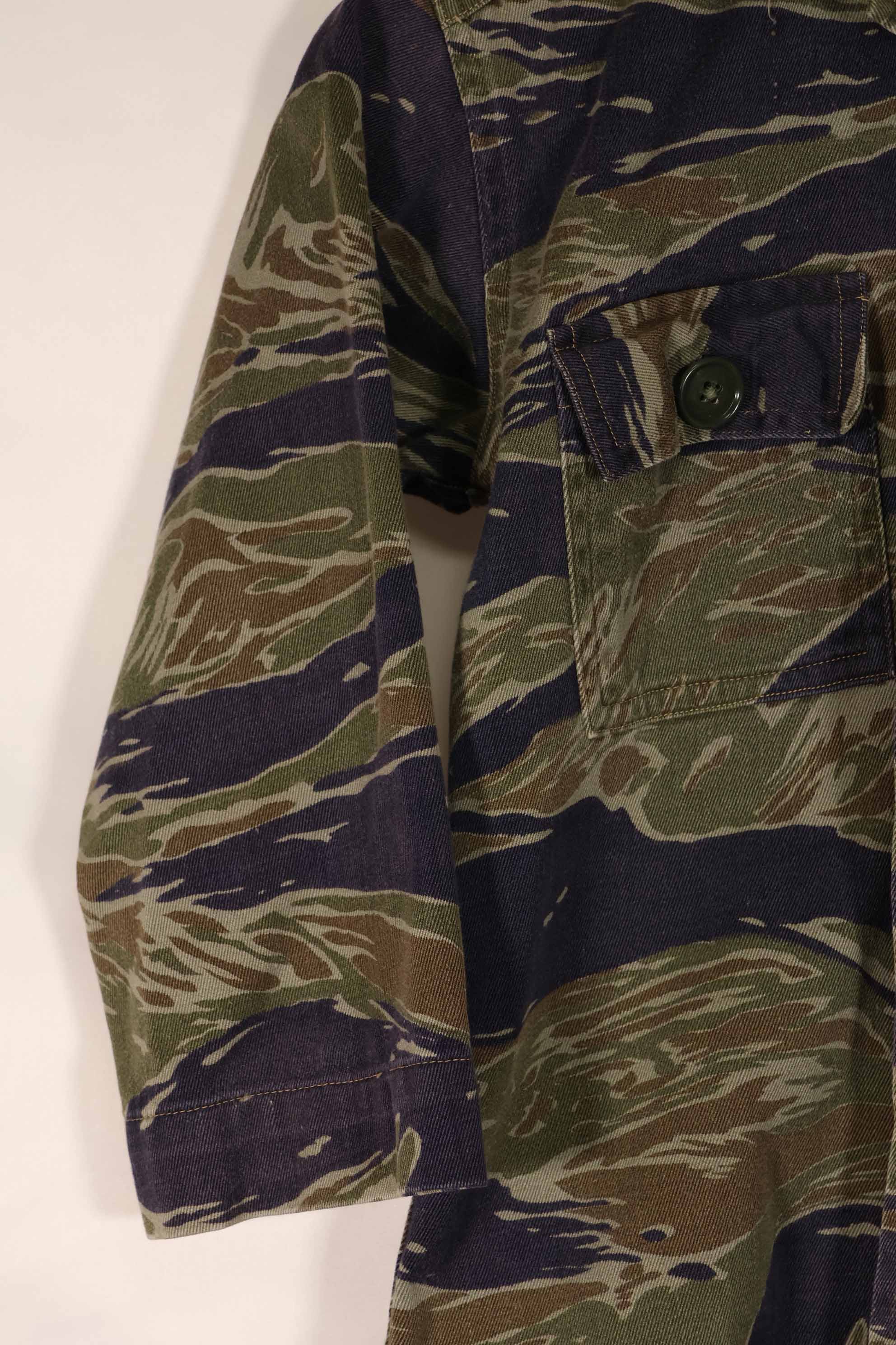 ベトナム戦争中に製造されたと思われる子供用にテイラーされたお土産品です。生地はシルバータイガーストライプパターンで、中古品を元に製造されたものと思われます。自身が使用したシャツをボタンなども含めて再使用したものと思います。退色などがありますが、良い雰囲気のタイガーストライプシャツです。コレクション、ご自身のお子様向けにいかがでしょうか。中古品ですので返品はできません。ご了承くださいませ。