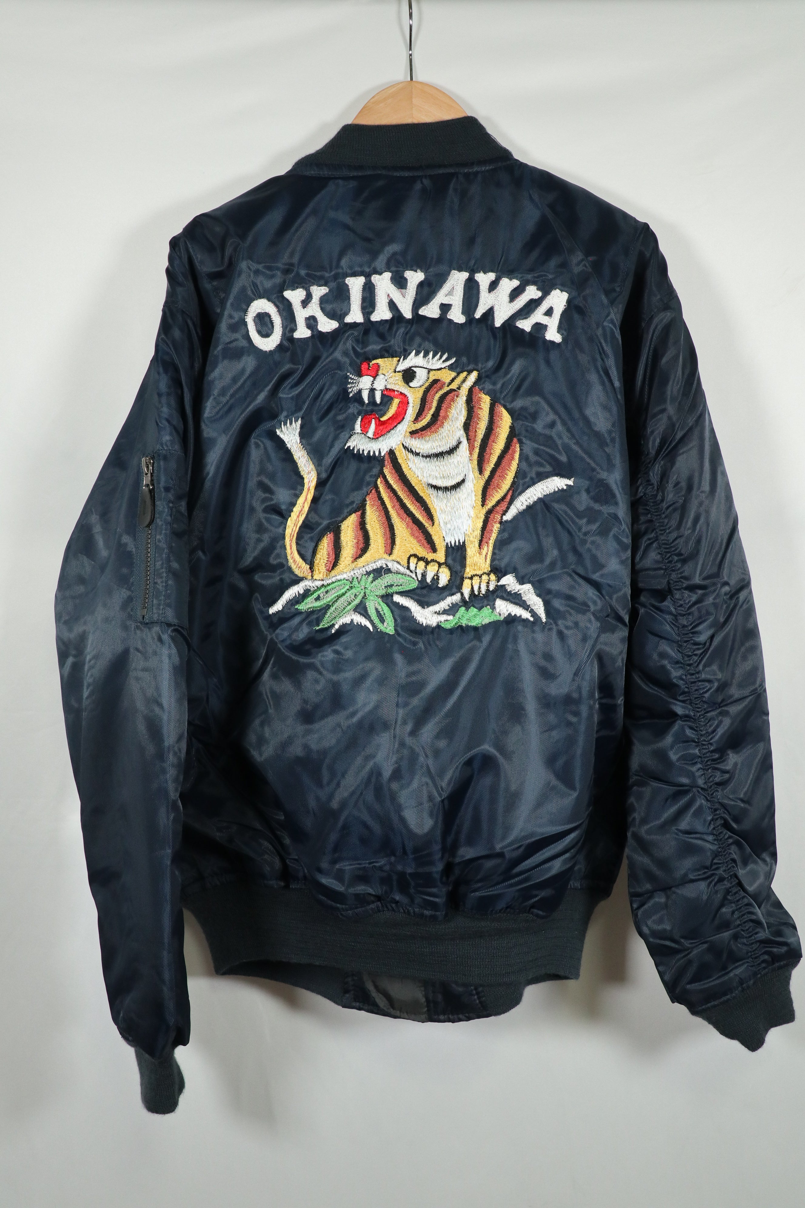 近年の沖縄製のスーバニアジャケットです。沖縄のコザに今も営業している刺繍店のもので、最近の作品です。ベトナム戦争当時も営業されていた歴史ある刺繍店のジャケットです。ベースは民間品のMA-1が使用されています。非常に素晴らしい刺繍が入っています。虎にOKINAWAの文字の入ったクラシックなデザインです。未使用品ですが、中古品扱いとさせていただきます。返品はできませんのでご了承くださいませ。