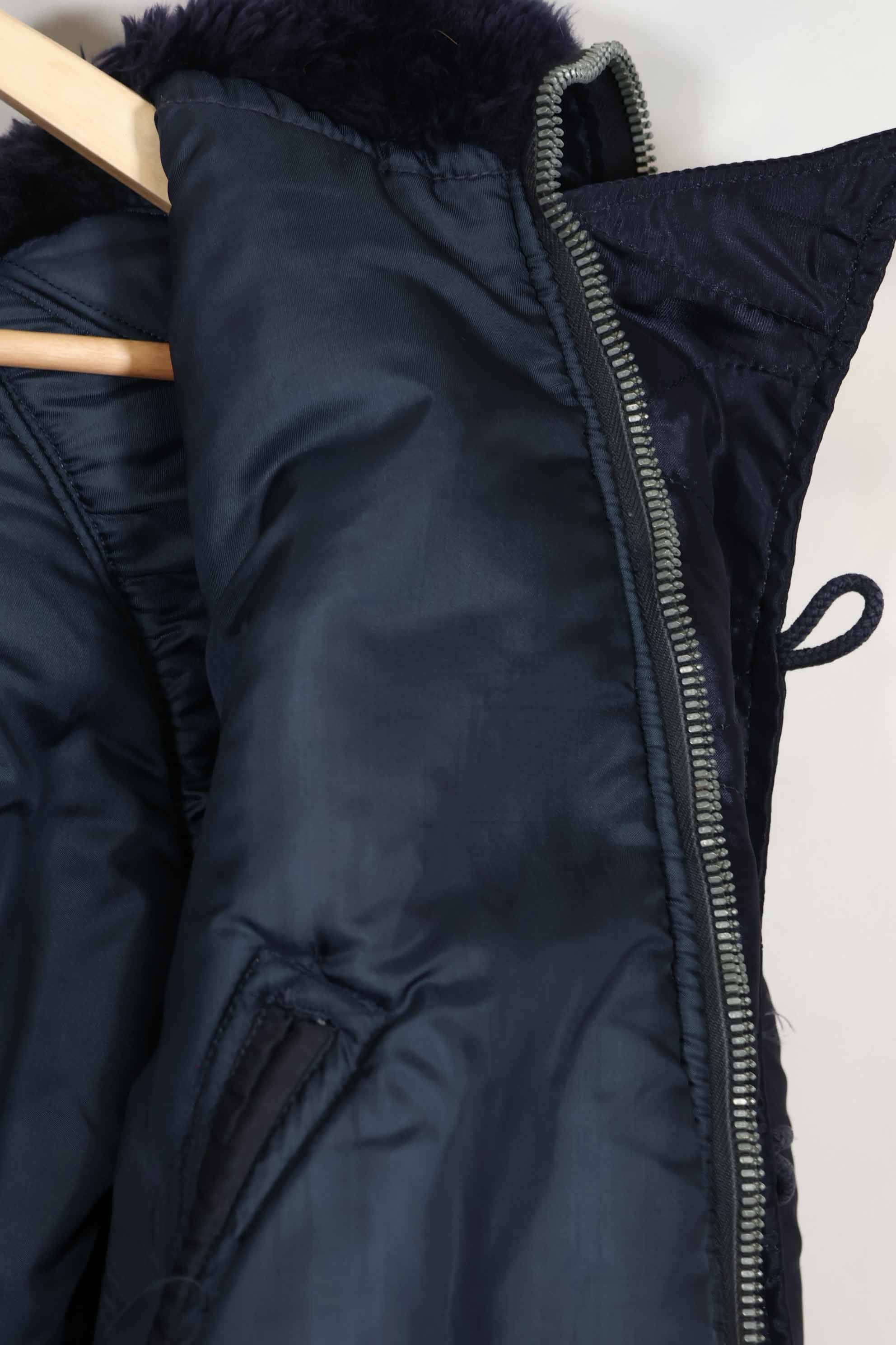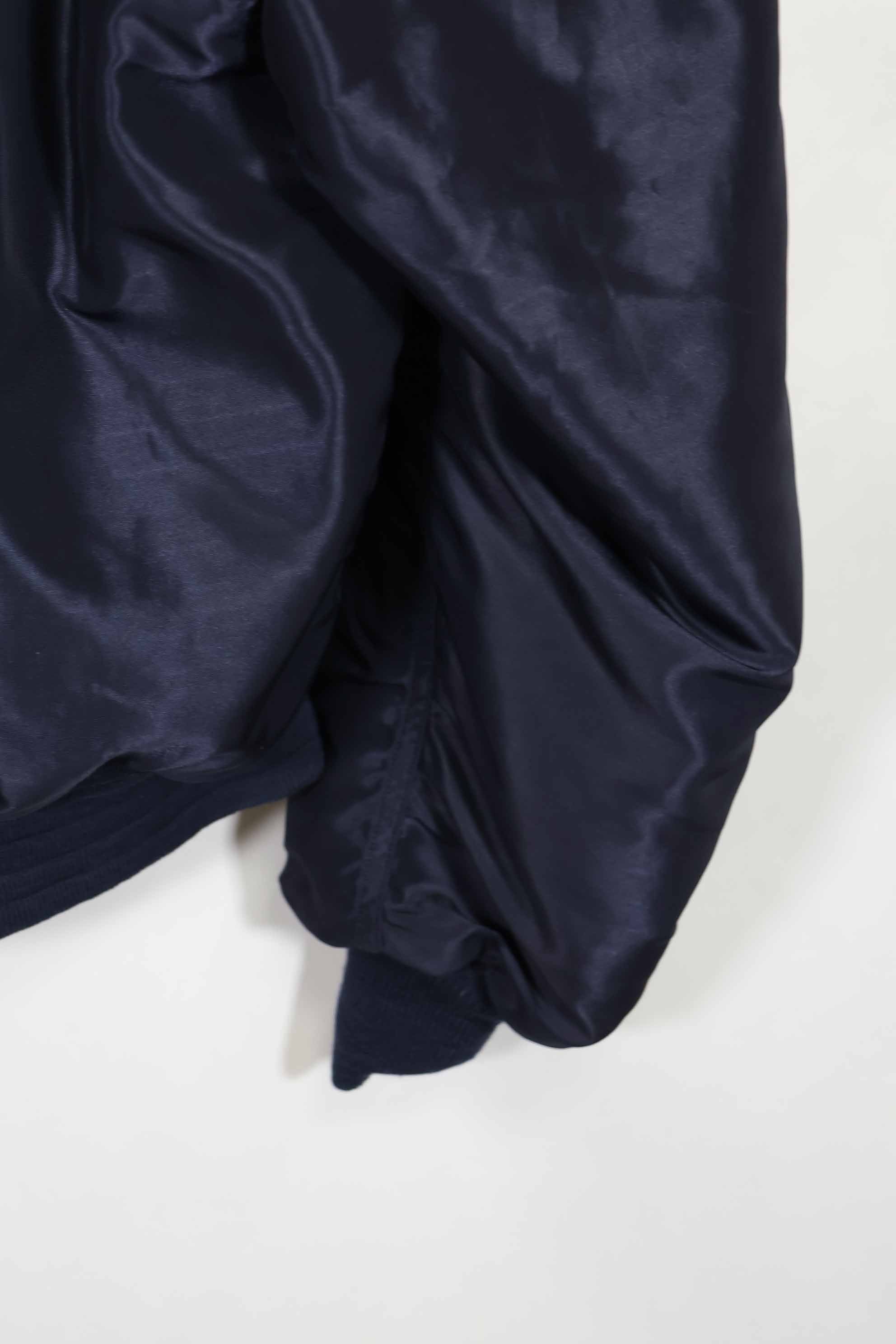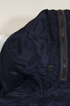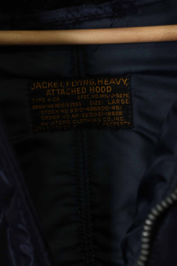 1950年代初頭ロットのアメリカ空軍N-2Aフライトジャケットの中古品です。このロットの特徴的な点はヒンジのついたCROWNジッパーが使用されている点です。フードのファーは取り外されており、フードに縁は縫い付けられていますが手縫いによるもののため解いていただくことで取り付けが可能です。それ以外に付属の欠損はありませんが、前ボタン一番下のボタンはリプレースされています。リブの破損、虫食いもほぼなく綺麗です。左袖付近に白い汚れがあります。着用感も少なく、エアフォースブルーの美しいジャケットです。サイズもLARGEと大きめです。約70年以上前の品物ではありますが状態は良いといえます。まだまだお楽しみいただけるコンディションです。中古品ですので返品はできません。ご了承下さいませ。