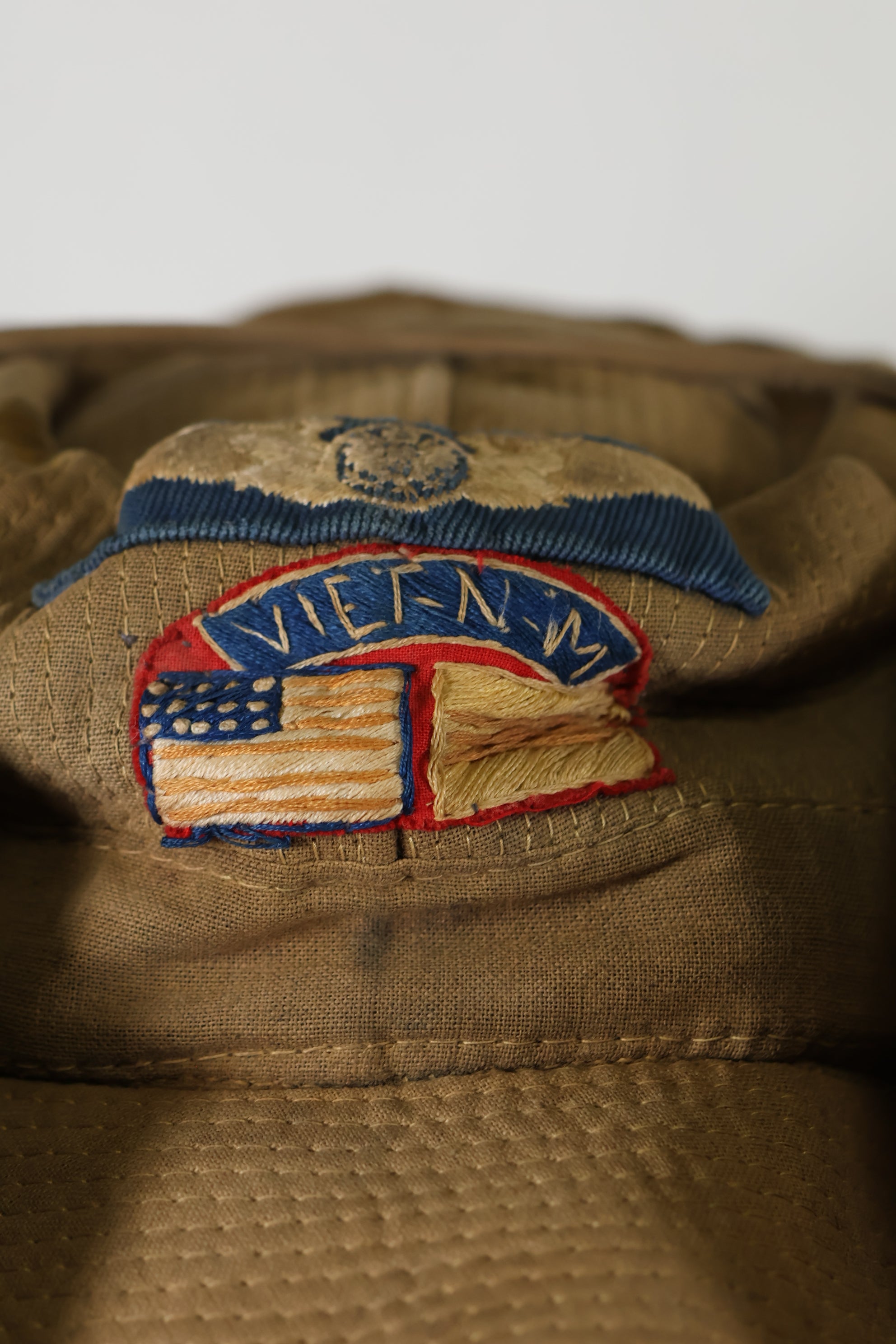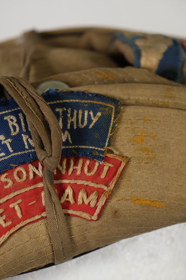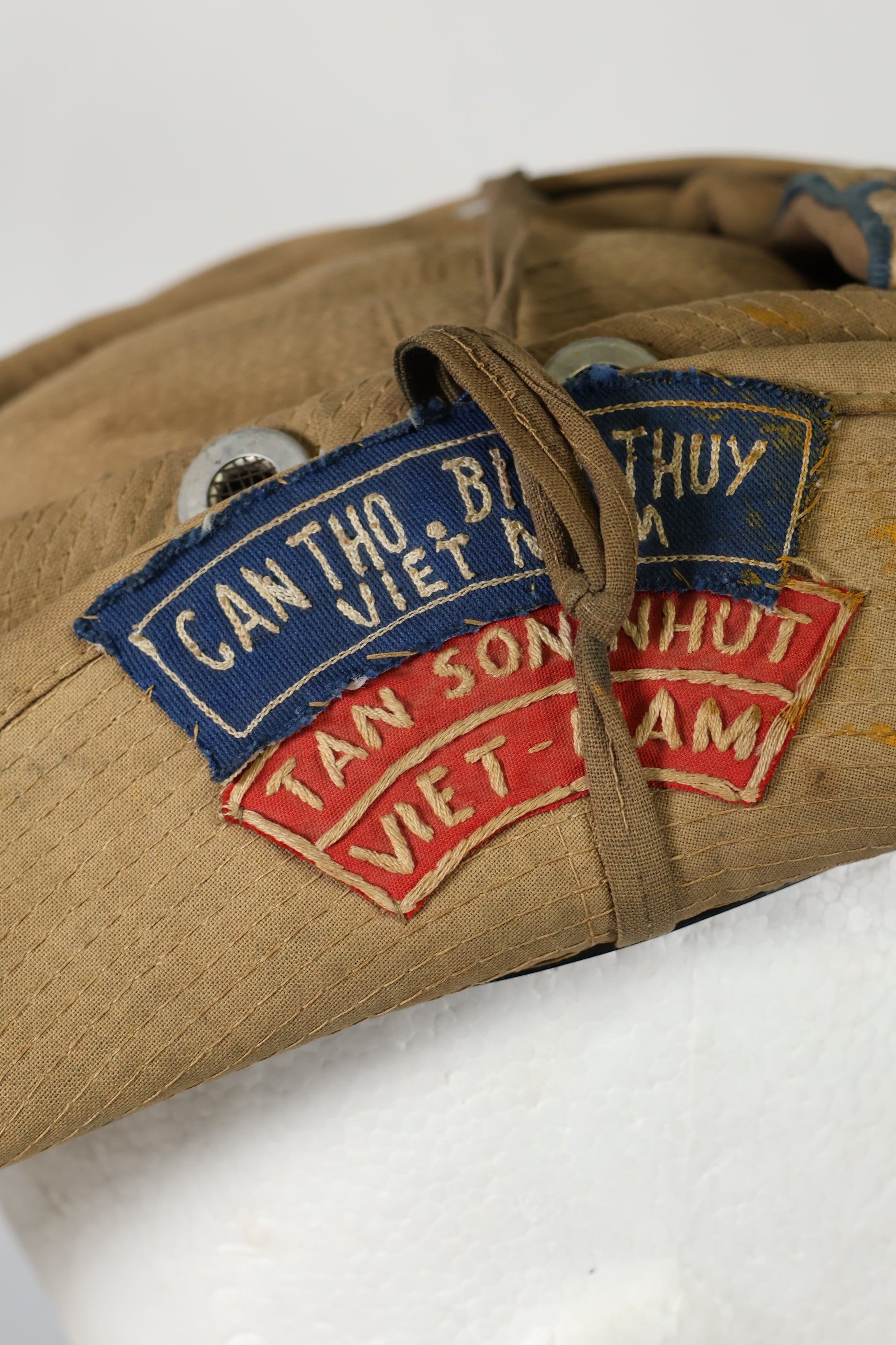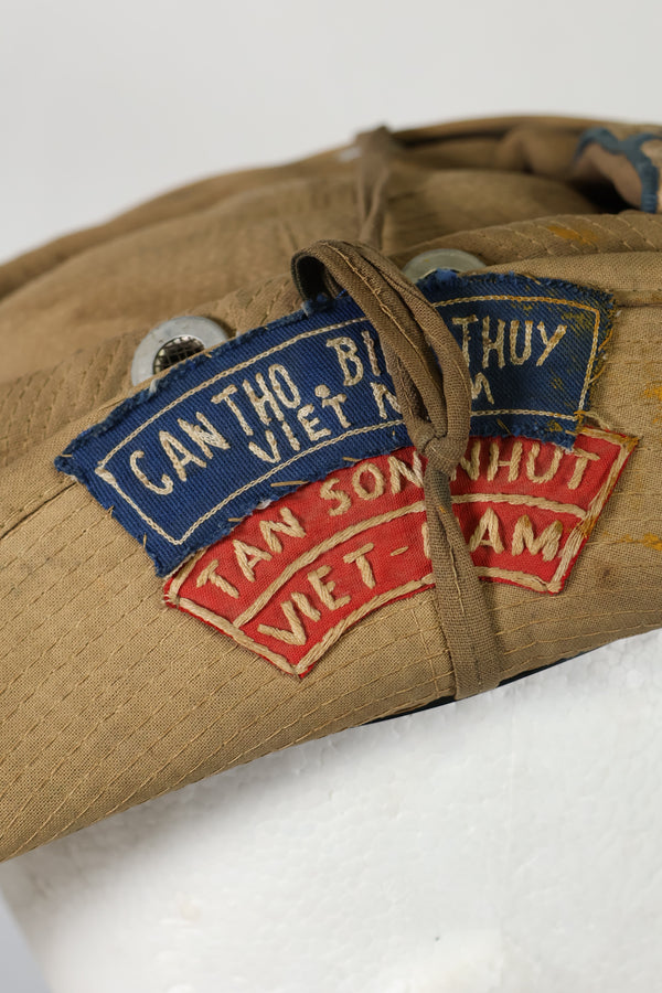 ローカルメイド品で当時のPXや街の売店などで販売されていたブッシュハットを改造しカウボーイスタイルにしたものと思われます。パッチも当時のローカルメイド品で、所属していた空軍基地の名前が入っており一つは現在もホーチミン市(当時のサイゴン)にあった、タンソンニュアット空港の地名が入っています。実際に当時使用されていたハットのため、汚れ、劣化などがあります。チンストラップは元々使用されていなかったようで、当時のまま縛られています。当時の調達品らしく個人調達品として非常に良い品物です。中古品ですので返品はできません。ご了承くださいませ。