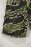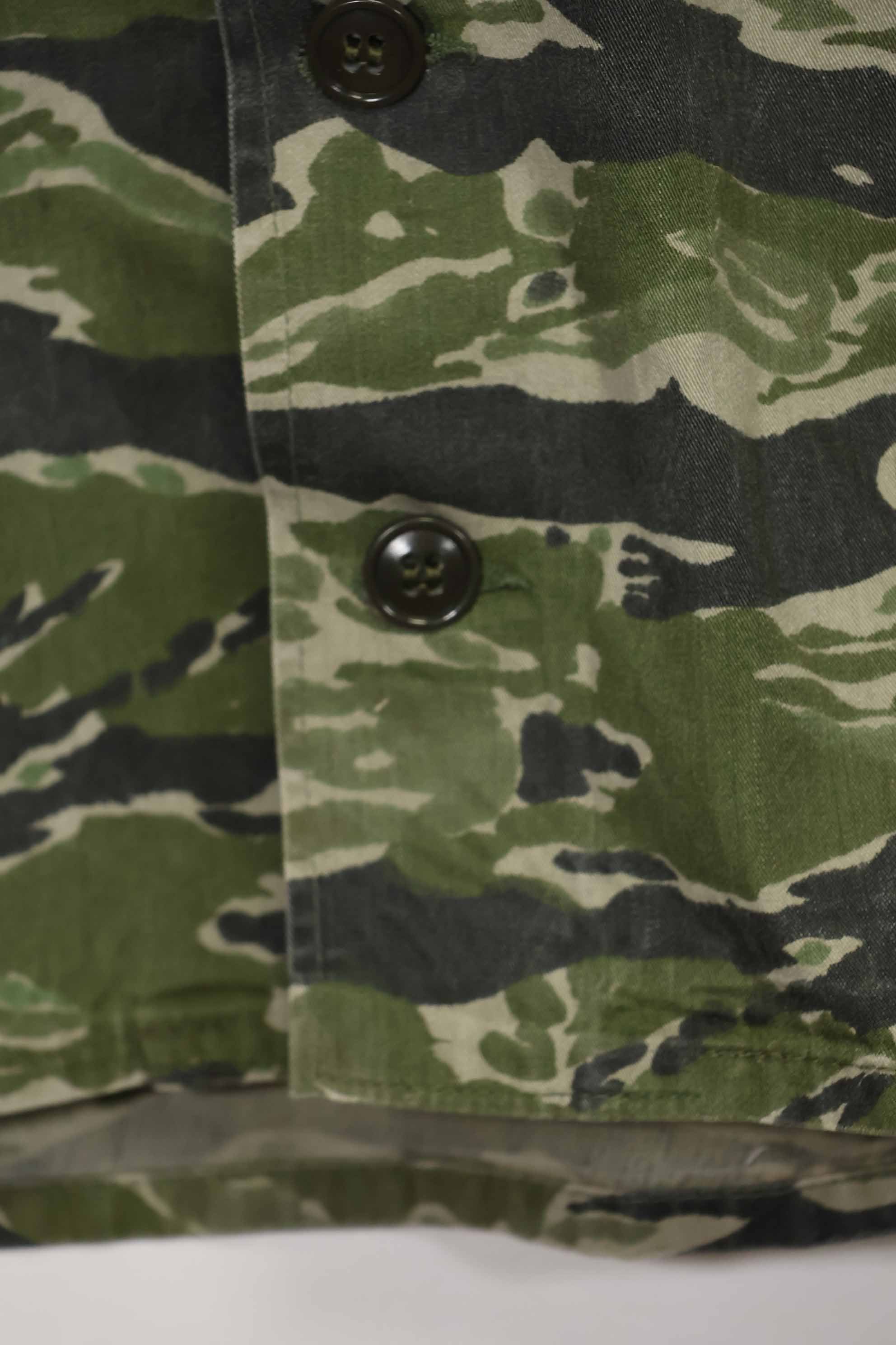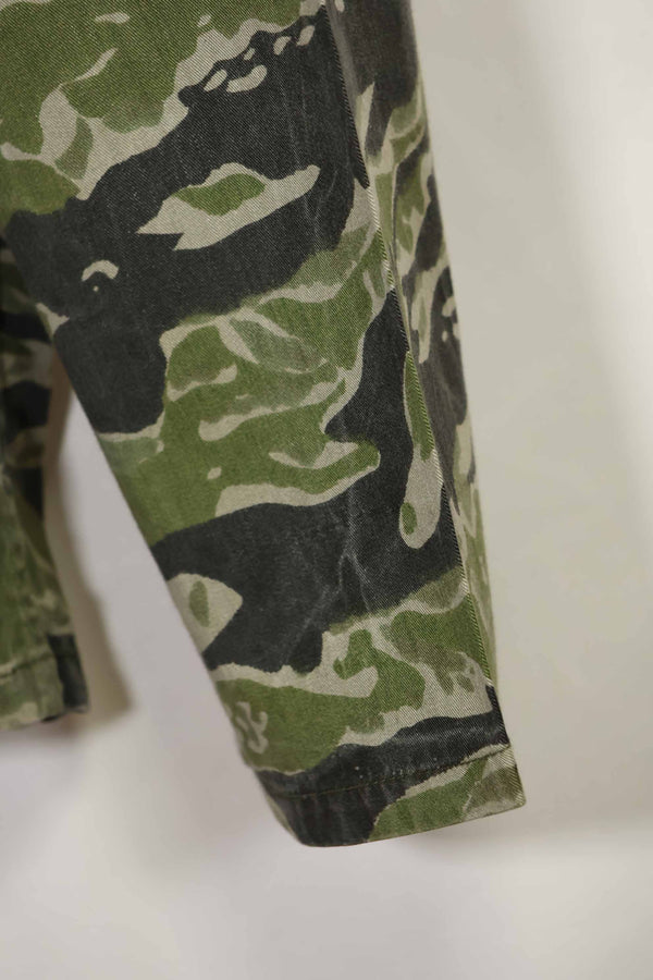 CIDGパターンはラフなプリントで生地も比較的堅めなのが特徴です。他の日本製のタイガーストライプに比べて異なる点が多いためおそらくベトナム製もしくは周辺諸国、例えばタイや台湾などの可能性も考えられます。ベトナム現地兵などが使用した例も多く、小さいサイズが多い中で比較的大きめサイズです。退色すると全体的に白くなります。比較的珍しいパターンです。中古品ですので返品はできません。ご了承くださいませ。