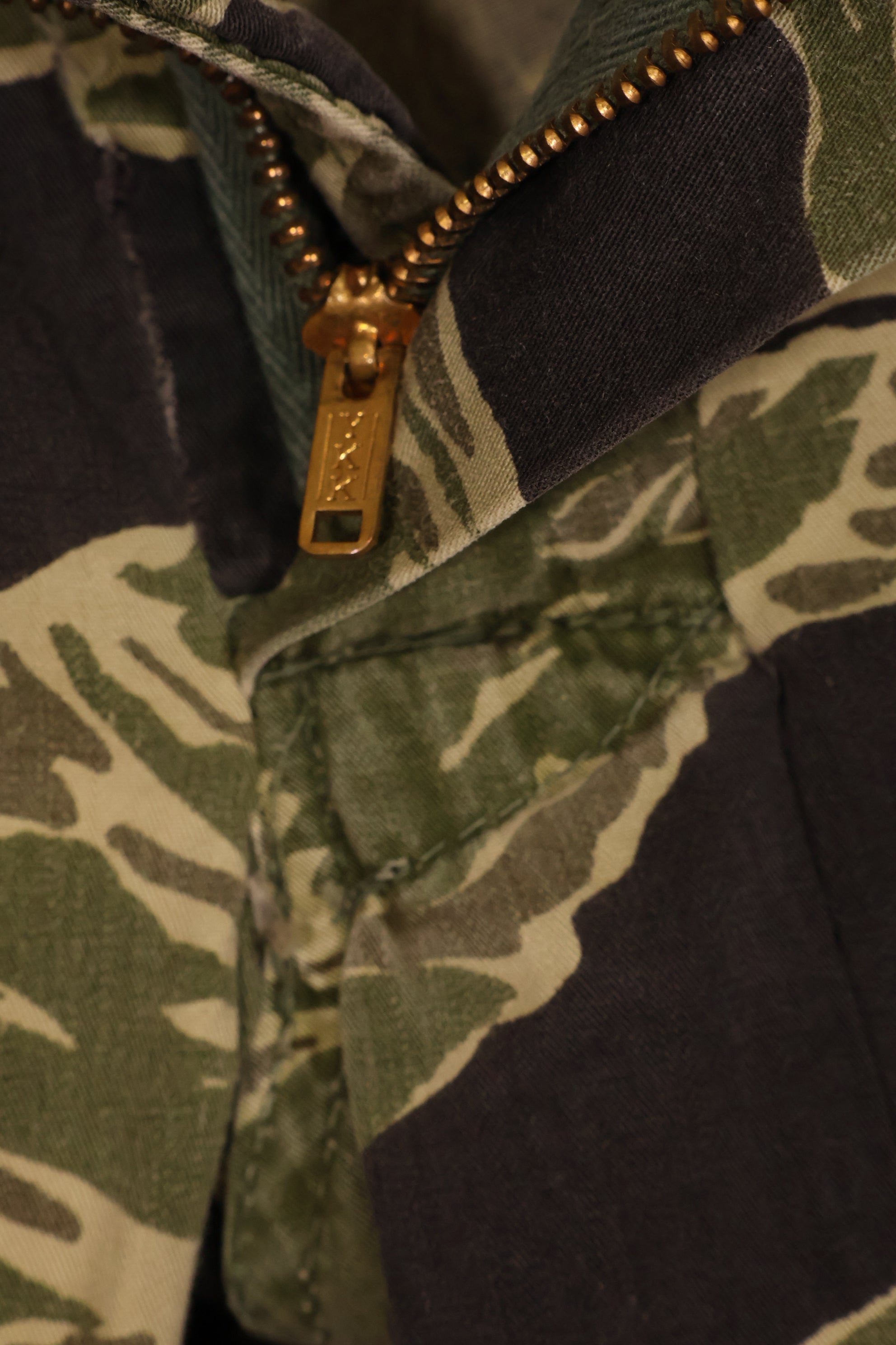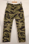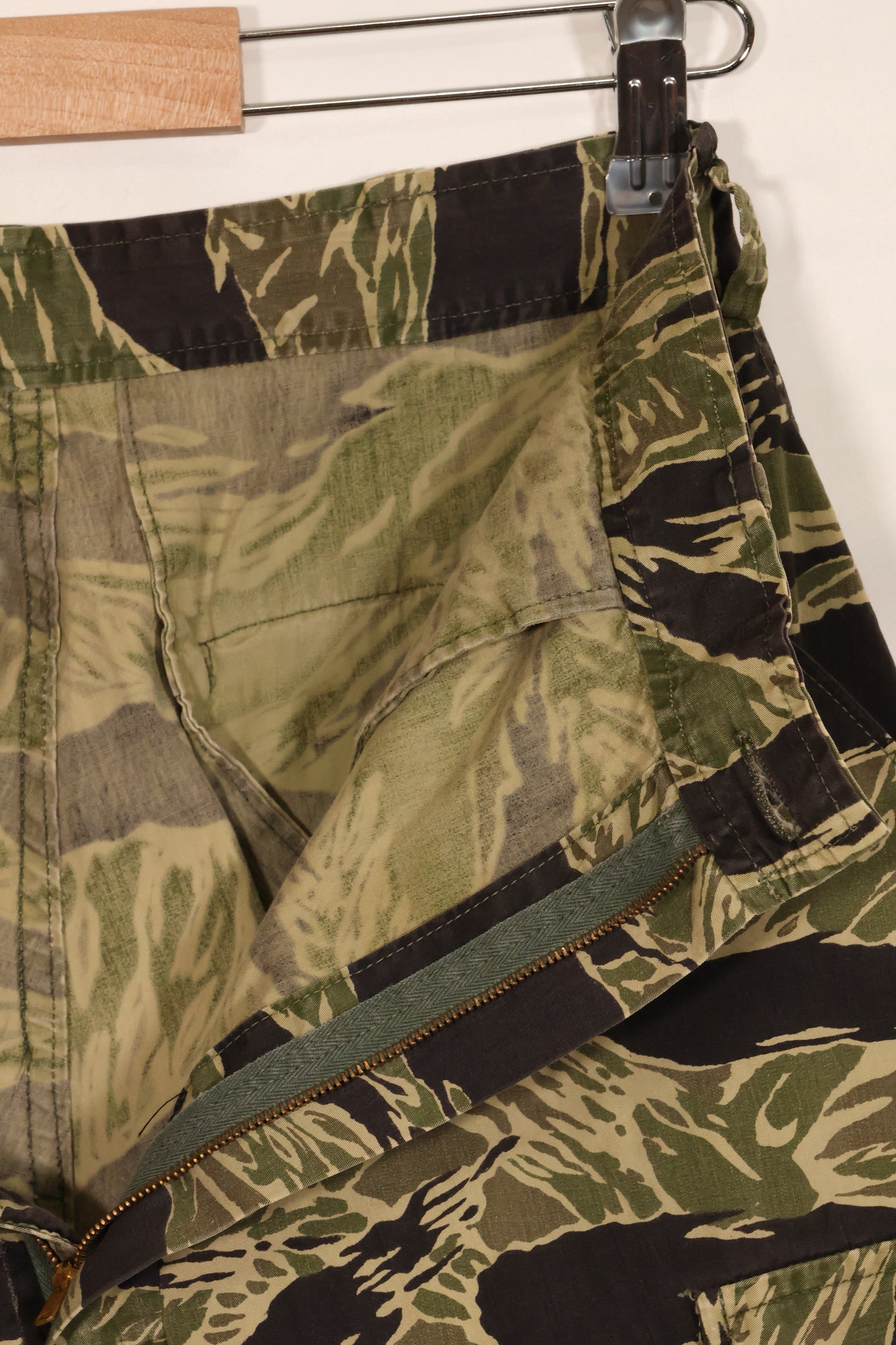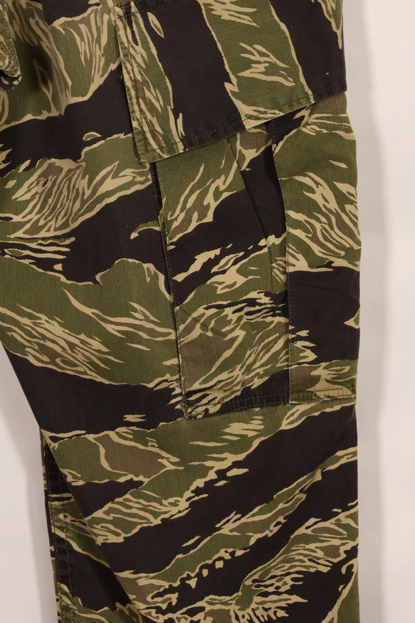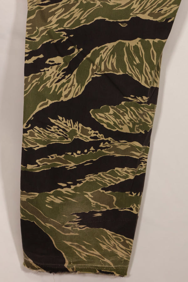 使用されているジッパーはYKKで、日本製のタイガーストライプと共通しておりおそらくこのパンツも沖縄、もしくは日本本土での製造品かと思われます。退色もすくなく、裾には調整した跡があります。薄手生地のタイガーストライプは非常に貴重な品物ですのでぜひお見逃しなく。中古品ですので返品はできません。ご了承くださいませ。同時出品でジャケットも販売中です!お見逃しなく!