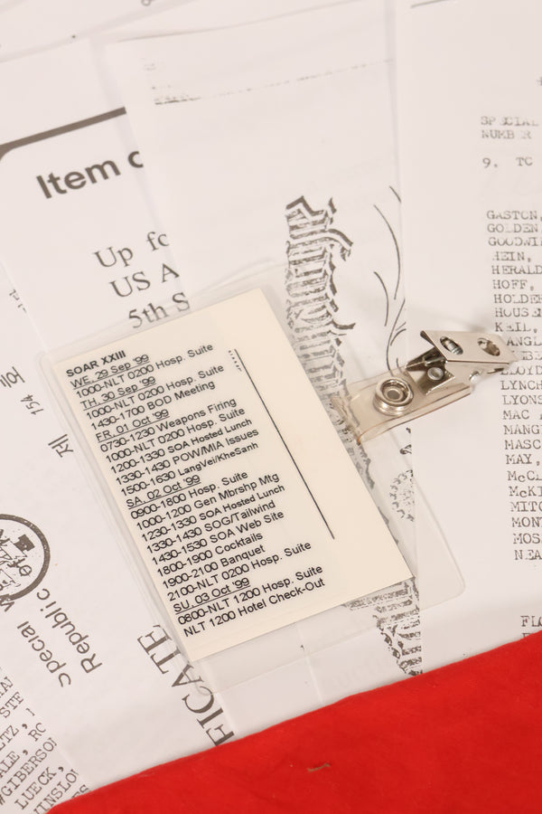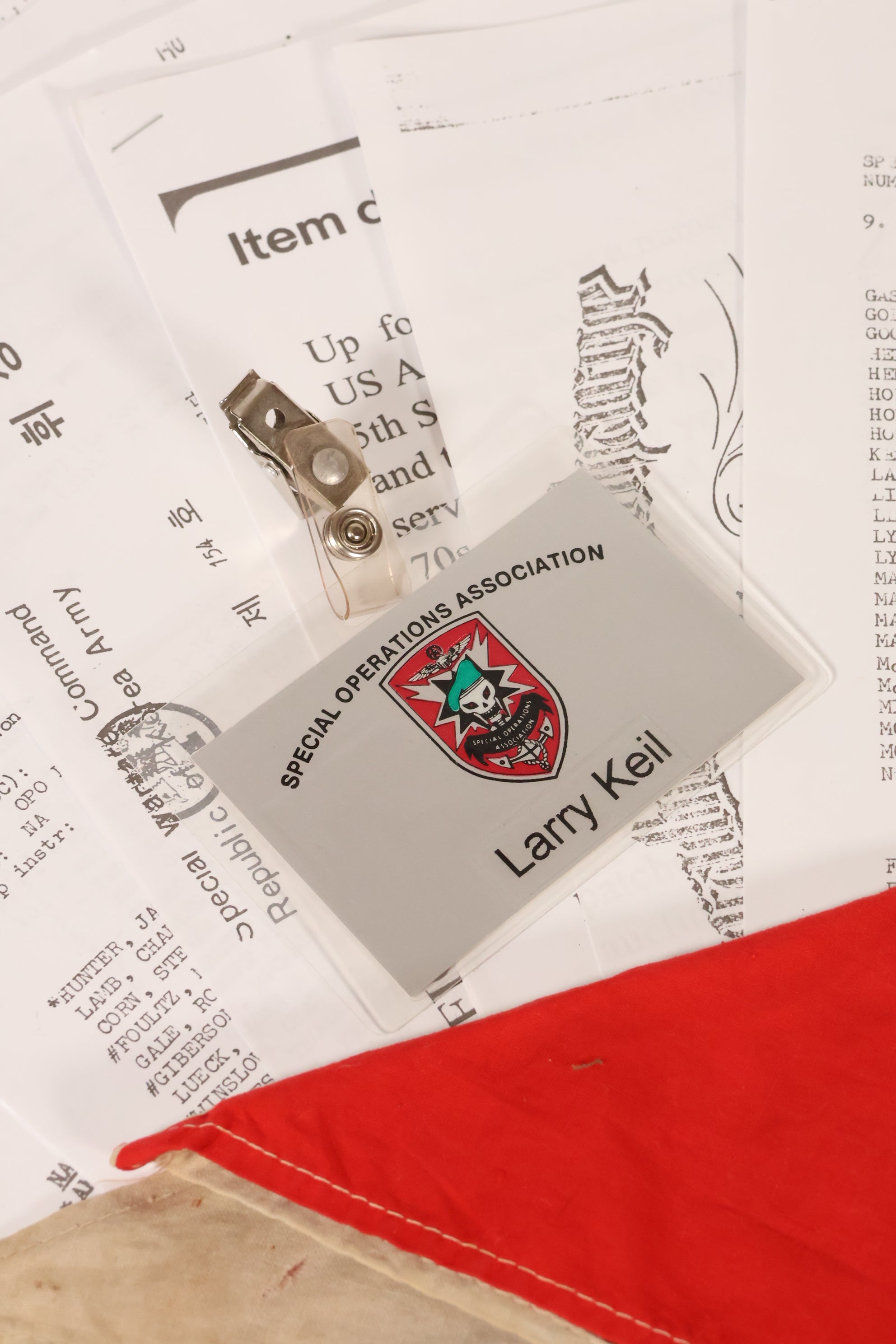 1960年代にMACV SOGのCCSに所属していたLarry Keil元SGTのスカーフと、ドキュメントコピー、1999年のイベント参加時の名札のグルーピングです。