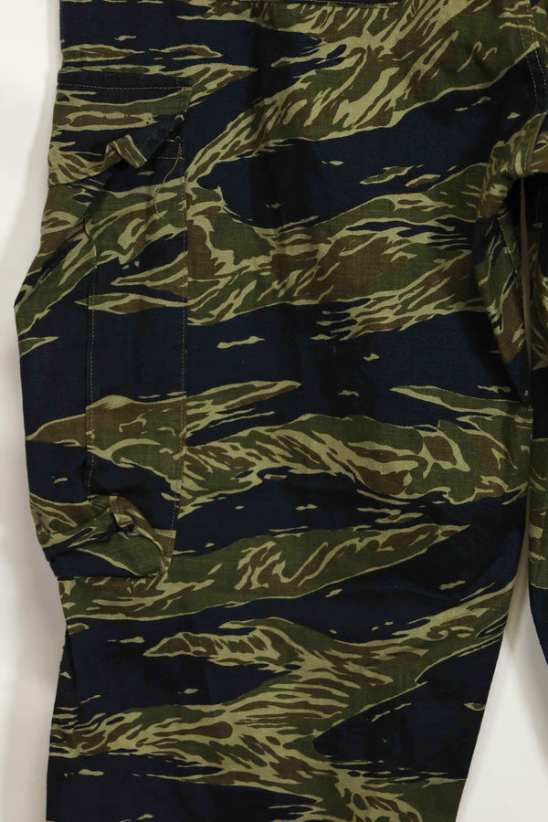 推定1960年代後半〜70年代前半ごろのロットのシルバータイガーパンツです。薄手生地が特徴的で、おそらく日本製の生地ではありますがベトナム戦争にて主に使用されたヘビーウェイトコットン生地ではなく後半に登場した薄手生地ロットのシルバータイガーストライプパンツです。ほぼ未使用品で退色も少なく綺麗な状態です。おそらくローカルメイド品です。