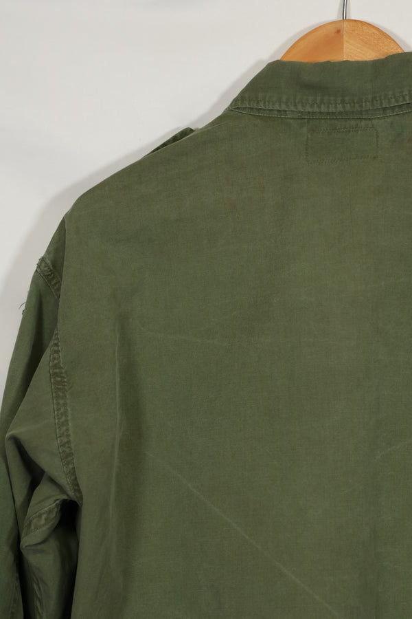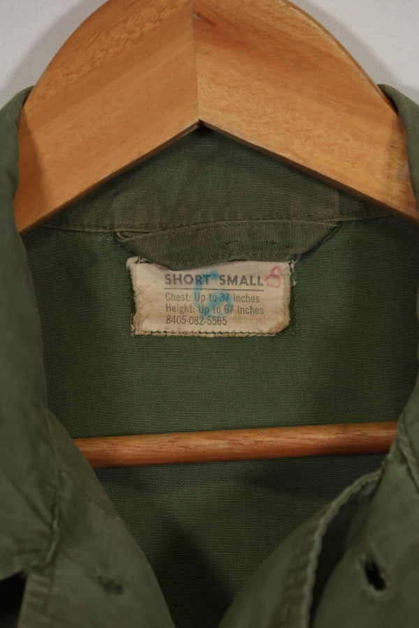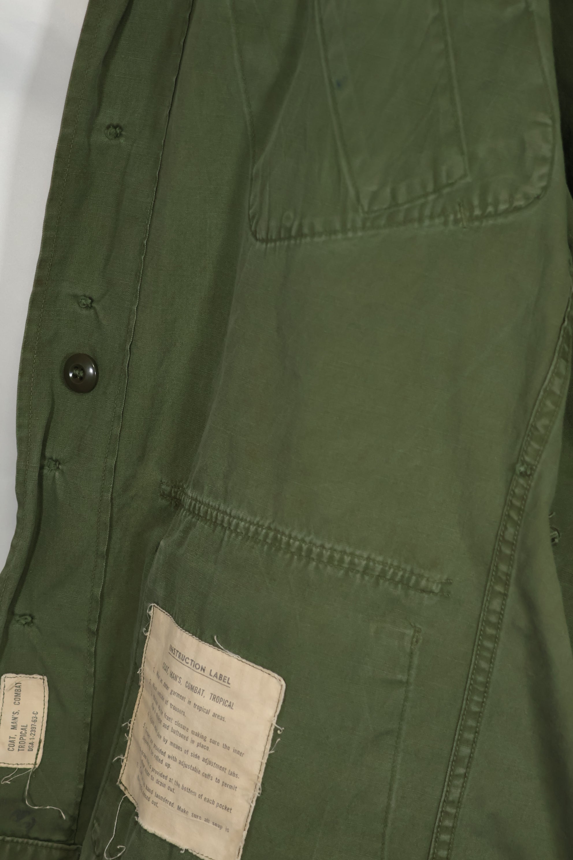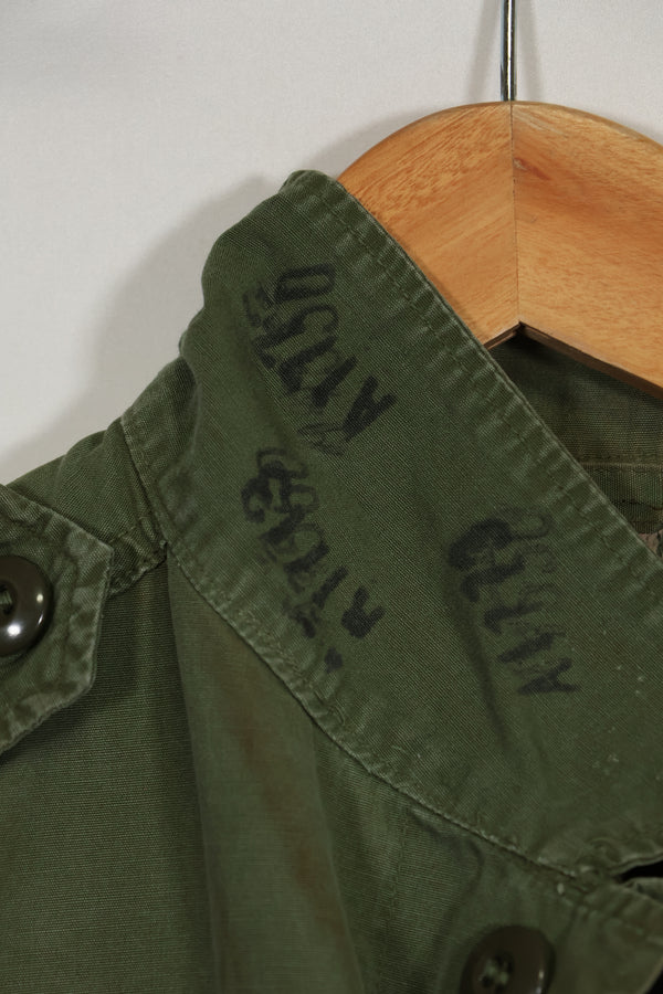 1963年製の1st Modelジャングルファティーグジャケットです。サイズはSMALL-SHORTと人気サイズ。101空挺師団のパッチが両腕に縫い付けられている素晴らしいジャケットです。左肩のAIRBONEタブ、胸のジャンプウィングなど、ネームテープは取り外されています。使用感が強くかなり使い込んだジャケットです。ネームテープのステンシルが裏写りし、ネームの跡が残っています。US ARMYのブランチテープもステンシル。空挺所属の古参兵が着用していたものと推測されます。襟裏にはステンシルが残っています。使用感は強いものの、ボタンの欠損や補修などもなくまだまだお楽しみいただけるコンディションです。中古品ですので返品はできません。ご了承くださいませ。