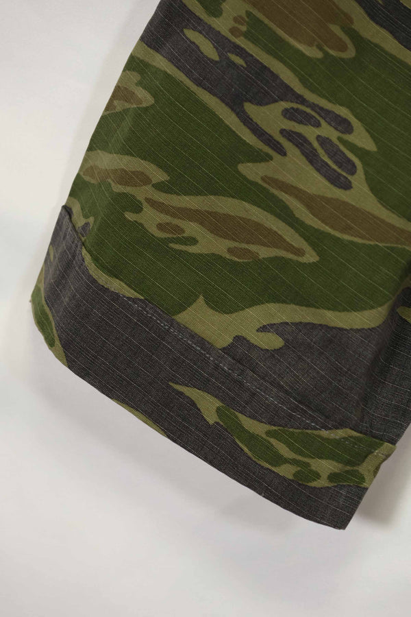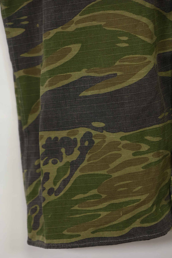 1970年代前半ごろより使用され始めた戦争末期のタイガーストライプシャツです。主に、南ベトナム海兵隊や特殊部隊などが使用したパターンです。薄手生地が特徴的でこちらの個体はリップストップ生地が採用されています。乾きやすく、薄手のタイガーストライプに改良されたものと思われます。生産国は正確にはわかっておらず、パターンの状態などから日本ではなくベトナム本国もしくはその周辺国かと推測されます。
